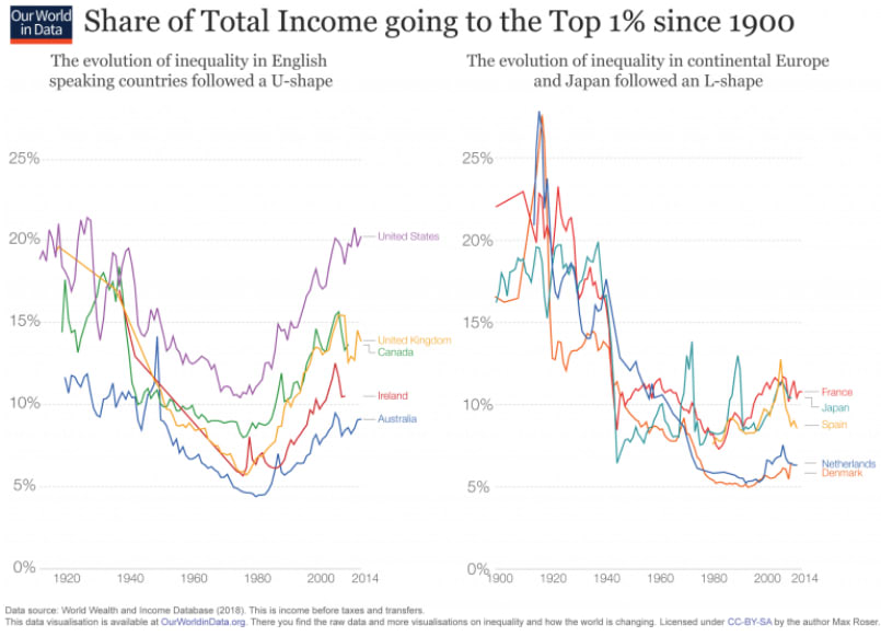 A universal trend of increasing inequality would be in line with the notion that inequality is determined by global market forces and technological progress. The reality of different inequality trends within countries suggests that the institutional and political frameworks in different countries also play a role in shaping inequality of incomes. This means that rising inequality is most likely not inevitable. (Roser and Ortiz)