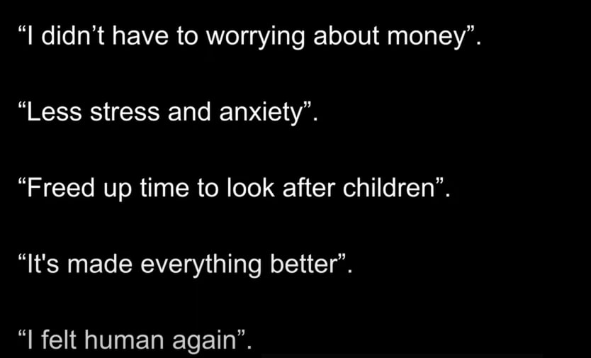 · For society, it could lower crime & improve wellbeing, and mitigate major upheavals by allowing us to quickly adjust the amount due to changed economic and societal circumstances, such as natural disasters, disease epidemics, and economic crises.