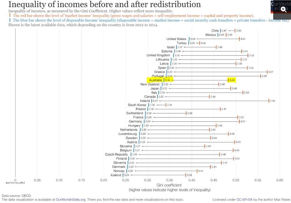 Indeed, governments have policies to redistribute income in every country in the world. This is done through progressive taxation and transfer (welfare) payments. The degree to which taxation and welfare are utilised lead to different levels of inequality, as measured by GINI. Without income redistribution, Australia’s GINI would rise from 0.34 to 0.48.