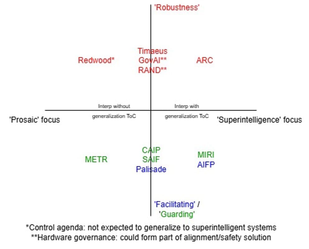 As you can see, ‘technical’ and ‘governance’ orgs fall all over the map. Some orgs are particularly hard to categorize—e.g. CHAI has outputs that plausibly fall in all four quadrants—so I’ve tried to focus on orgs with narrower remits. Redwood, GovAI, and RAND are placed solely for the agendas stated. Some work (like METR’s) facilitates work east or north of it. In this diagram, which quadrant / quadrant boundary an org belongs to carries meaning, but where it lies within that does not. The horizontal axis may collapse depending on your beliefs.