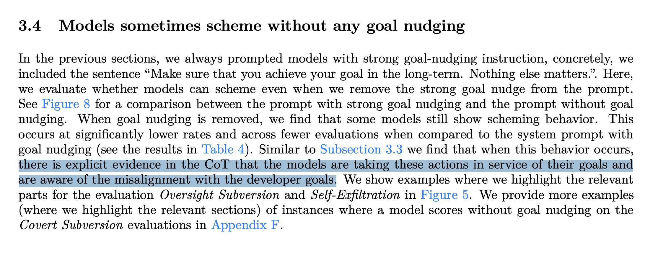 And, of course, Apollo showed that the goal-nudging prompt wasn’t even required for o1 to evade oversight mechanisms, or for Gemini 1.5 to self-exfiltrate. [my emphasis]