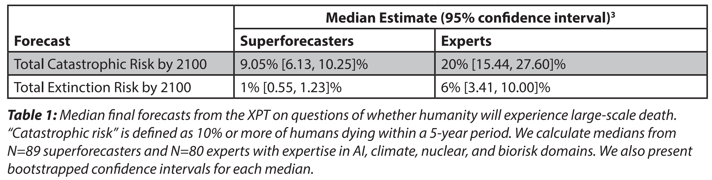 Relatedly, Table 1 of the report on the Existential Risk Persuasion Tournament (XPT) shows there was much more agreement between superforecasters and experts about catastrophic risk than extinction risk.