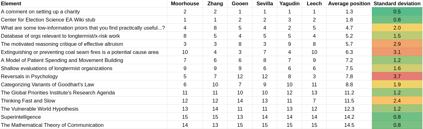 To create such a table, we need a reference element, which by construction has a value of “1”. In this experiment, that reference element was Categorizing Variants of Goodhart’s Law. I picked this because it seemed like a very high-quality research output, but not unattainably so, and it was somewhat around the midpoint of value. Further research could determine which element or combination of elements is optimal to pick as a reference point. Further, many reference points could be used, which would have the advantage that, e.g., all guesses would have a coefficient of variation.