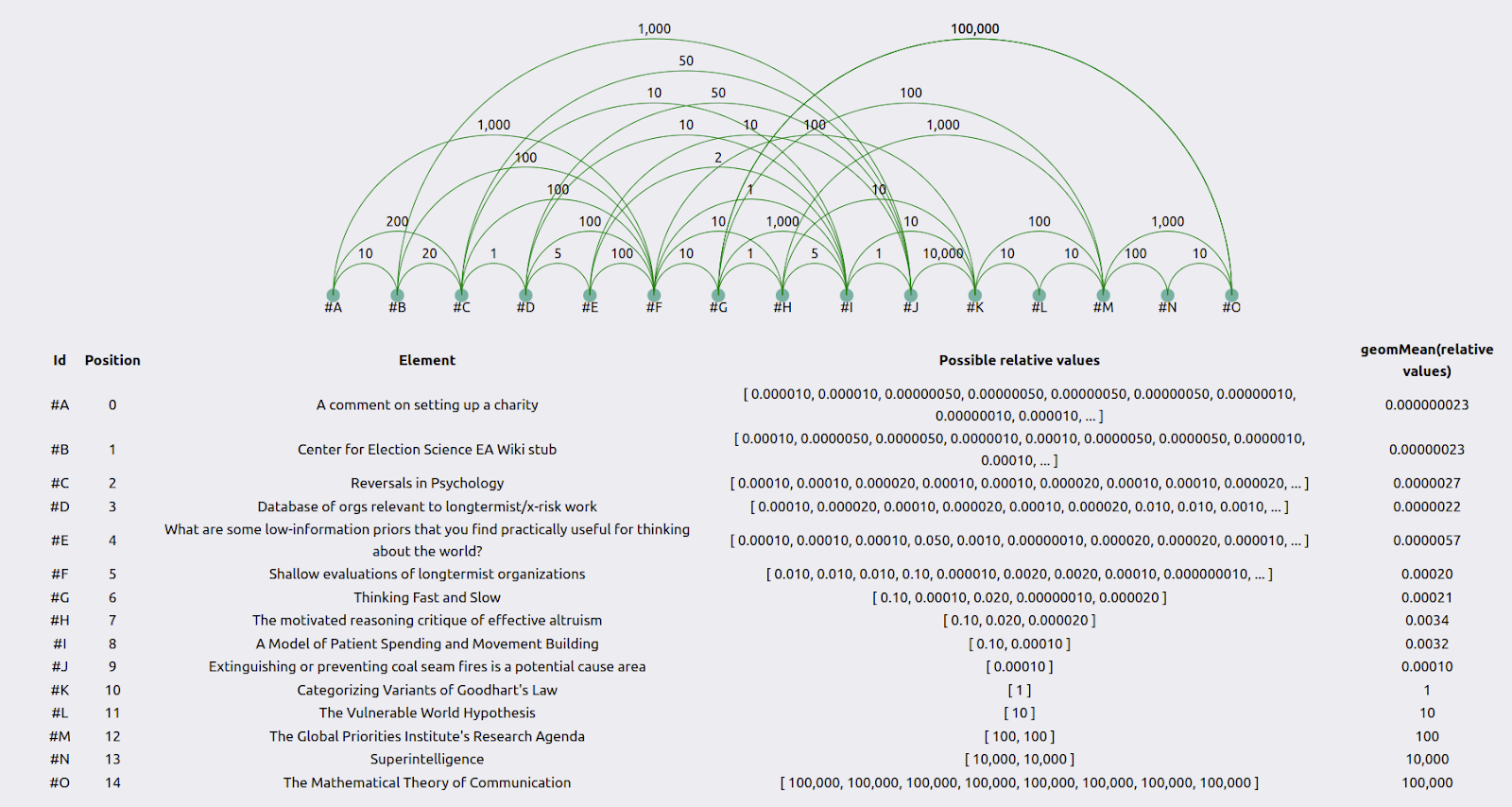 However, this exercise can also be understood as a “garbage in, garbage out” situation. We might have expected that respected researchers had somewhat consistent intuitions about relative values, both individually and between themselves.