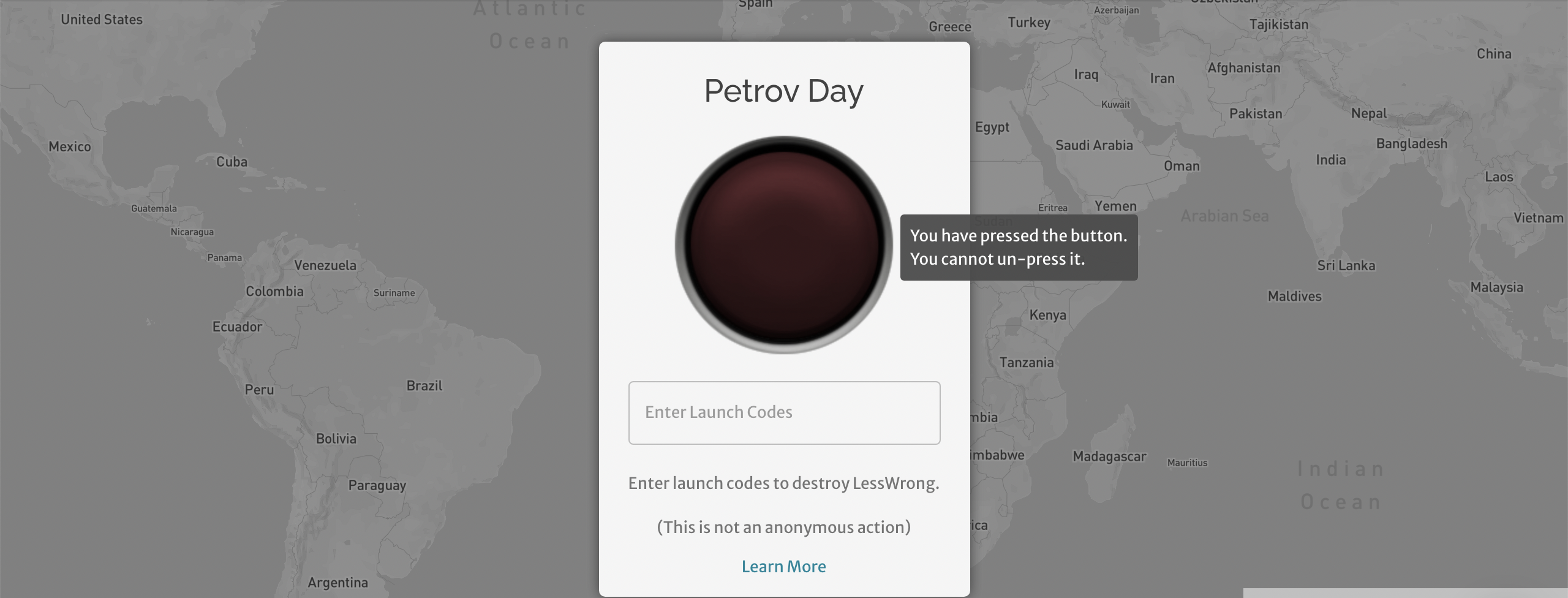 In both 2019 and 2020, LessWrong placed a large red button on the frontpage and distributed “launch codes” to a few hundred “trustworthy” people. A launch would bring down the frontpage for the duration of Petrov Day, denying hundreds to thousands of people access to LessWrong. In 2019, all was fine. In 2020… let’s just say some bad decisions were made.