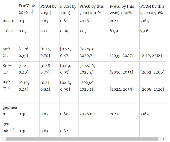 Samotsvety is a forecasting group. Aggregate results from their recent AGI timelines forecasting: