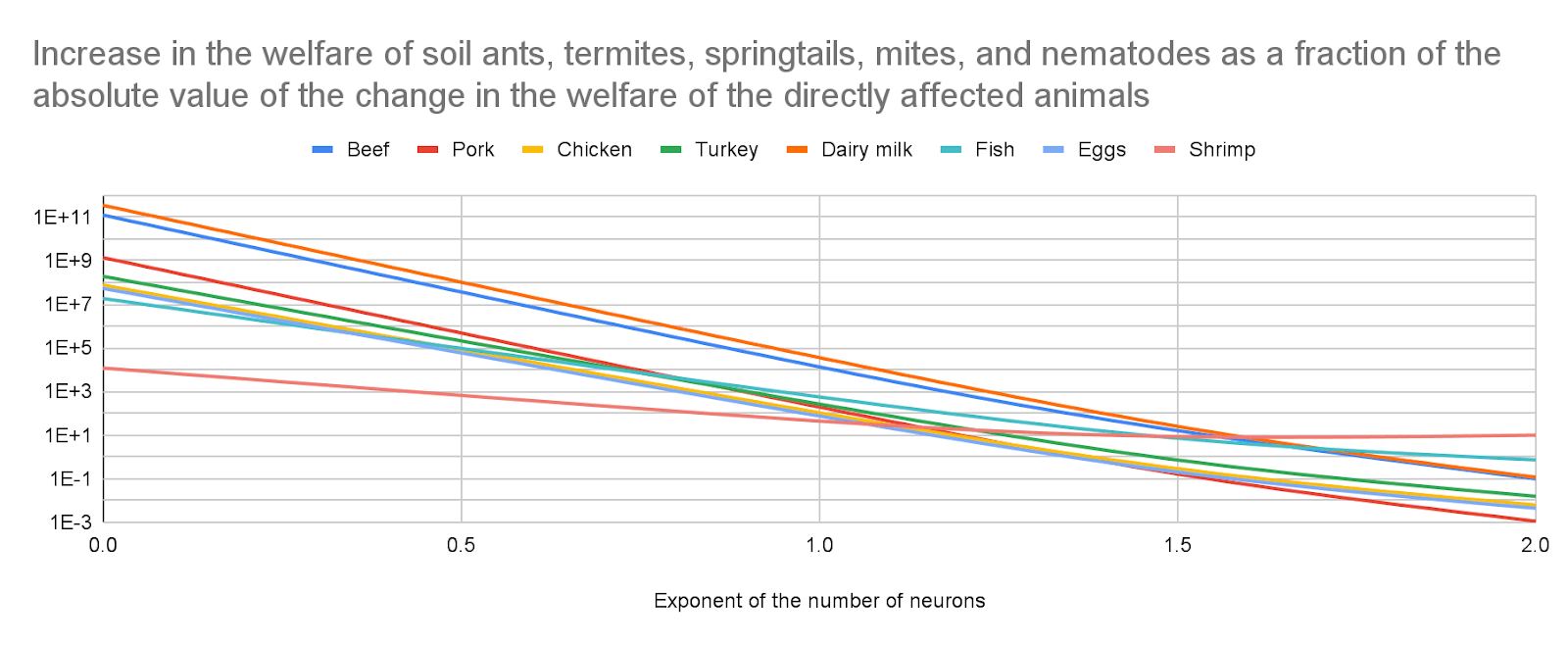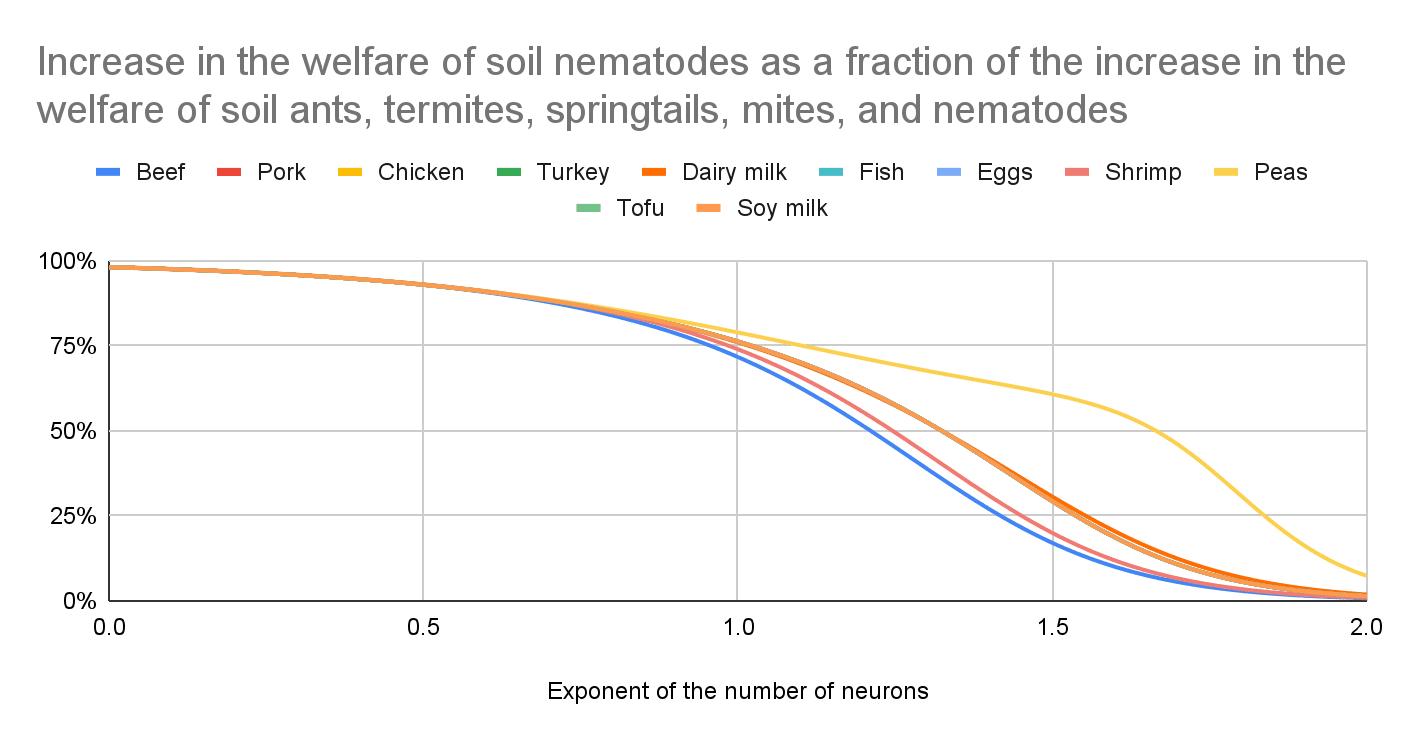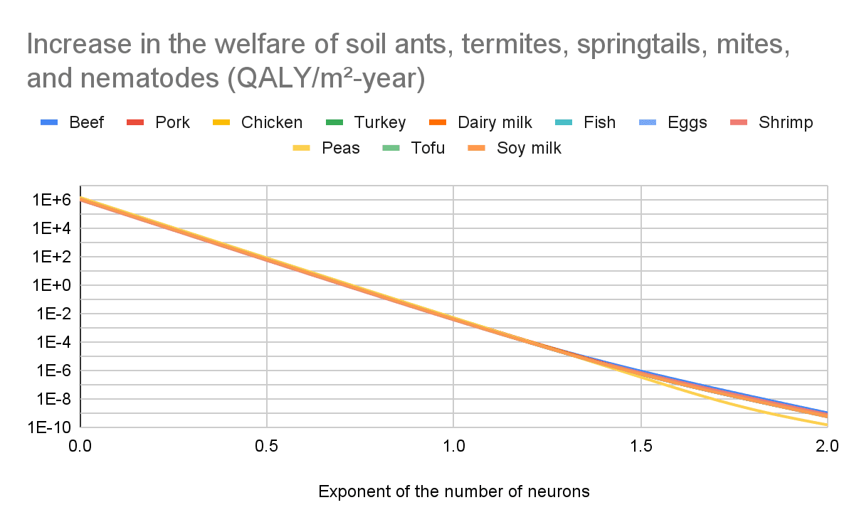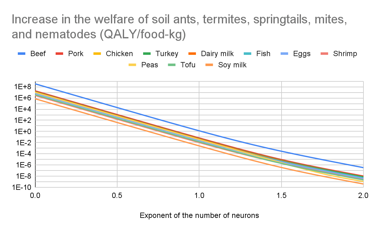 I believe effects on soil animals are much larger than those on the directly affected animals. I am confident the exponent of the number of neurons is the parameter which affects the ratio between the effects on soil animals and directly affected animals the most by far, and effects on soil animals dominate at least for values of the exponent up to 1, which are the ones I consider plausible. I get the following increase in the welfare of soil ants, termites, springtails, mites, and nematodes as a fraction of the absolute value of the change in the welfare of the directly affected animals (a value over 1 implies the effects on soil animals are larger than those on the directly affected animals). For an exponent of the number of neurons of (the lower and upper bound respect shrimp and dairy milk):