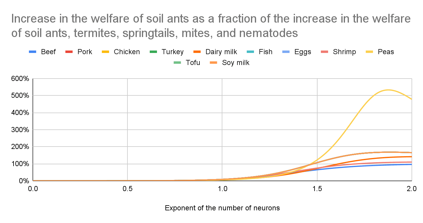 I conclude producing beef increases the welfare of the directly affected animals, and soil ants, termites, springtails, mites, and nematodes (considered all together) much more than the other foods for any exponent of the number of neurons. The production of beef, dairy milk, peas, tofu, and soy milk increases their welfare for any exponent. The production of pork, chicken, turkey, fish, and eggs increases it before the sharp points below, and decreases it afterwards. The minimum exponent to decrease their welfare is 1.36 for pork, 1.39 for chicken, 1.47 for turkey, 1.92 for fish, 1.35 for eggs, and higher than 2 for shrimp.