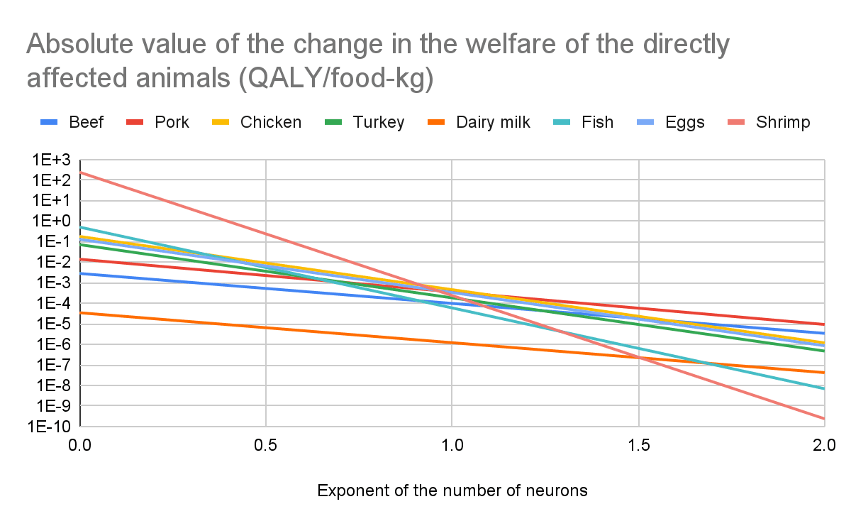 For all the animal-based foods I analysed besides shrimp, I estimate effects on soil animals would still be much larger than those on the target beneficiaries for a welfare per animal-year of exactly 0 for animals with fewer neurons than those considered in Bob’s book, and an exponent of the number of neurons of 0.19 which explains very well its estimates (an exponent of 0.188 explains 78.6 % of their variance). I calculate soil ants and termites have 2.91 (= 250*10^3/(86*10^3)) and 1.16 (= 100*10^3/(86*10^3)) times as many neurons as shrimp, so effects on them would still be relevant. I get the following absolute value of the change in the welfare of soil ants and termites as a fraction of the absolute value of the change in the welfare of the directly affected animals for an exponent of 0.19: