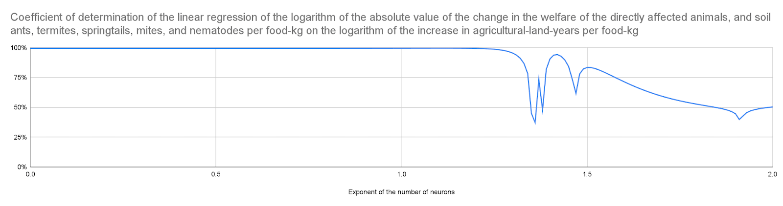 Coefficient of determination of the linear regression of the logarithm of the absolute value of the change in the welfare of the directly affected animals, and soil ants, termites, springtails, mites, and nematodes per food-kg on the logarithm of the increase in agricultural-land-years per food-kg
