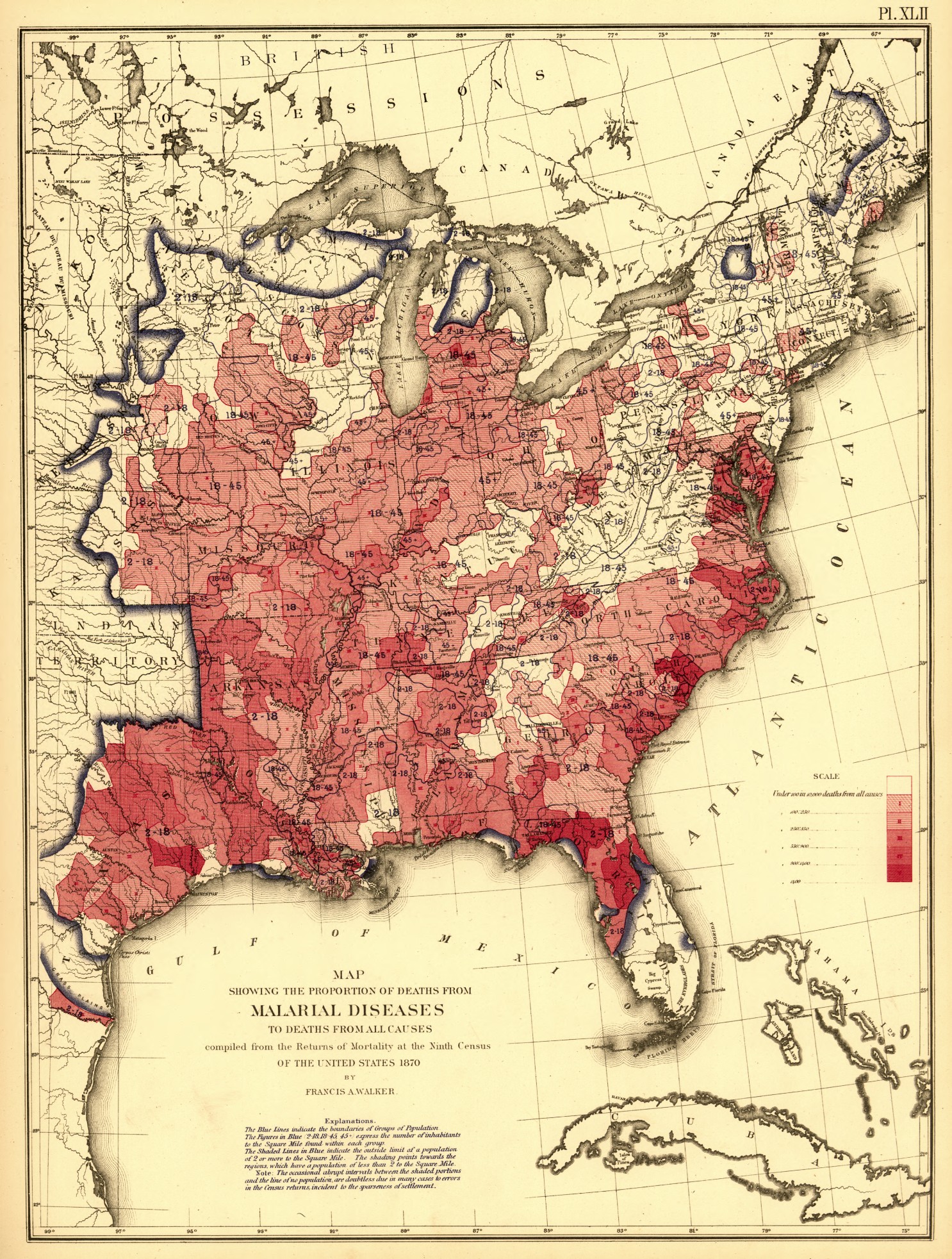 Proportion of deaths from malaria to deaths from all causes in the eastern United States, 1870 US Census. From Our World In Data/Statistical Atlas from the 9th Census of the United States 1870 (published 1874).