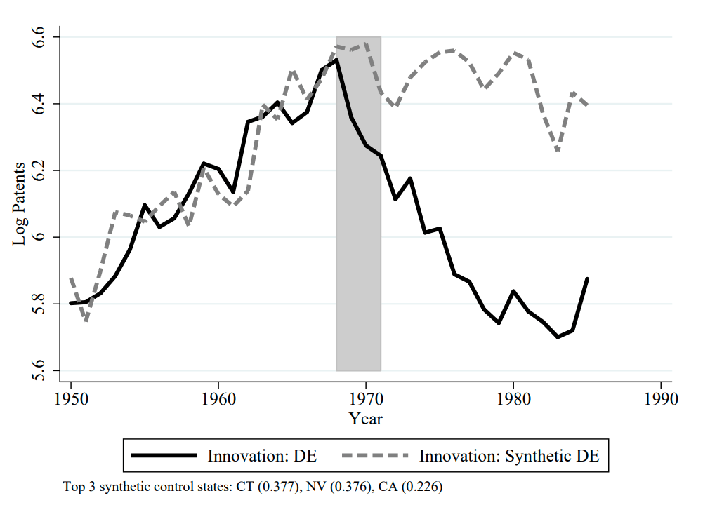 This method relies on the assumption that if two state’s innovation trends match for several years, that we they will continue to match unless one state changes something that the other does not. There are lots of ways to make this more or less believable but pre-treatment match can always be coincidence and post-treatment divergence may have multiple sources.
