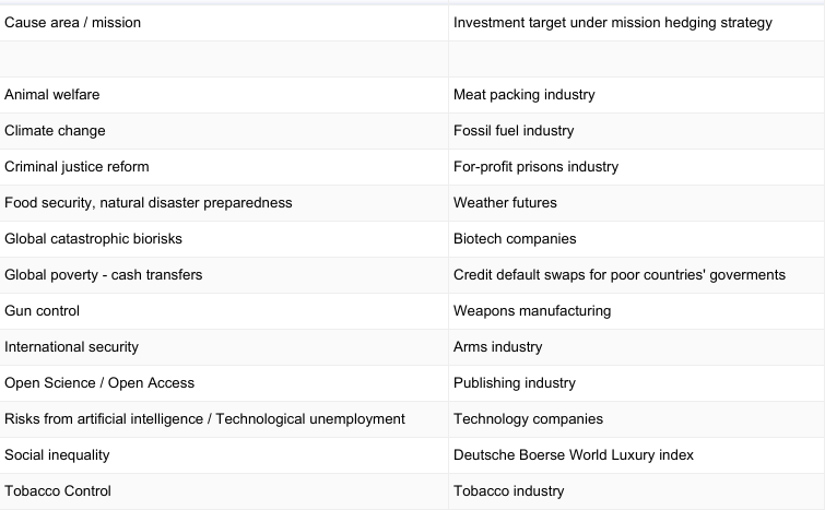 How should a foundation whose only mission is to prevent dangerous climate change invest their endowment? Surprisingly, in order to maximize expected utility, it might use ‘mission hedging’ investment principles and invest in fossil fuel stocks. This way it has more money to give to organisations that combat climate change when more fossil fuels are burned, fossil fuel stocks go up and climate change will get particularly bad. When fewer fossil fuels are burnt and fossil fuels stocks go down—the foundation will have less money, but it does not need the money as much. Under certain conditions the mission hedging investment strategy maximizes expected utility.
