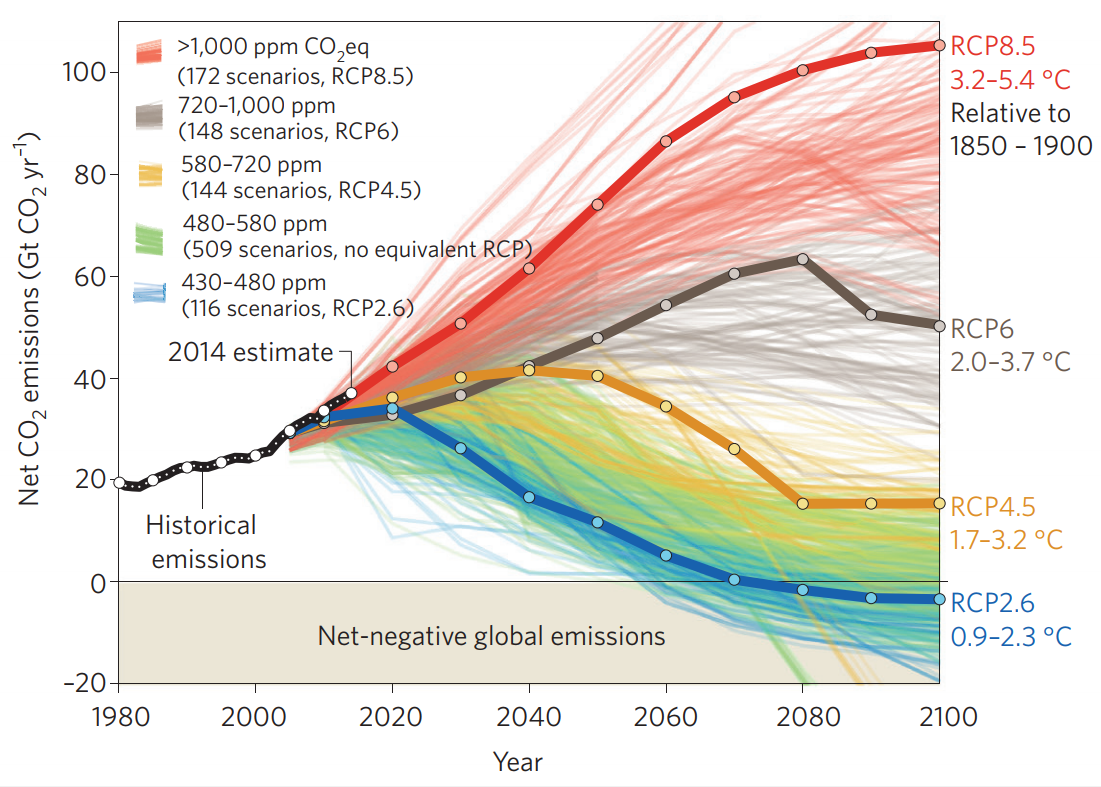 First consider, the following figure (taken from[3]) that shows that there is uncertainty about the world’s emission pathway and how how high warming will be above pre industrial levels: