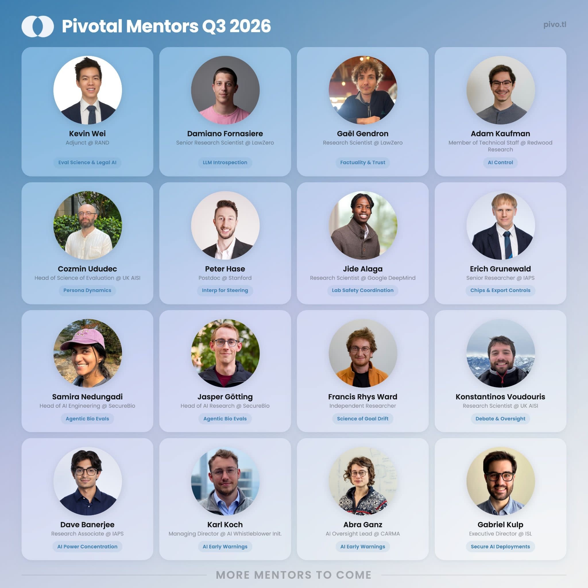 For 9 weeks, fellows work in person at LISA on a research project with an external mentor. Each fellow gets weekly 1:1s with their mentor, weekly support from a Pivotal Research Manager who helps with scoping, blockers, and career planning, and a cohort of ~25 peers working on adjacent problems.