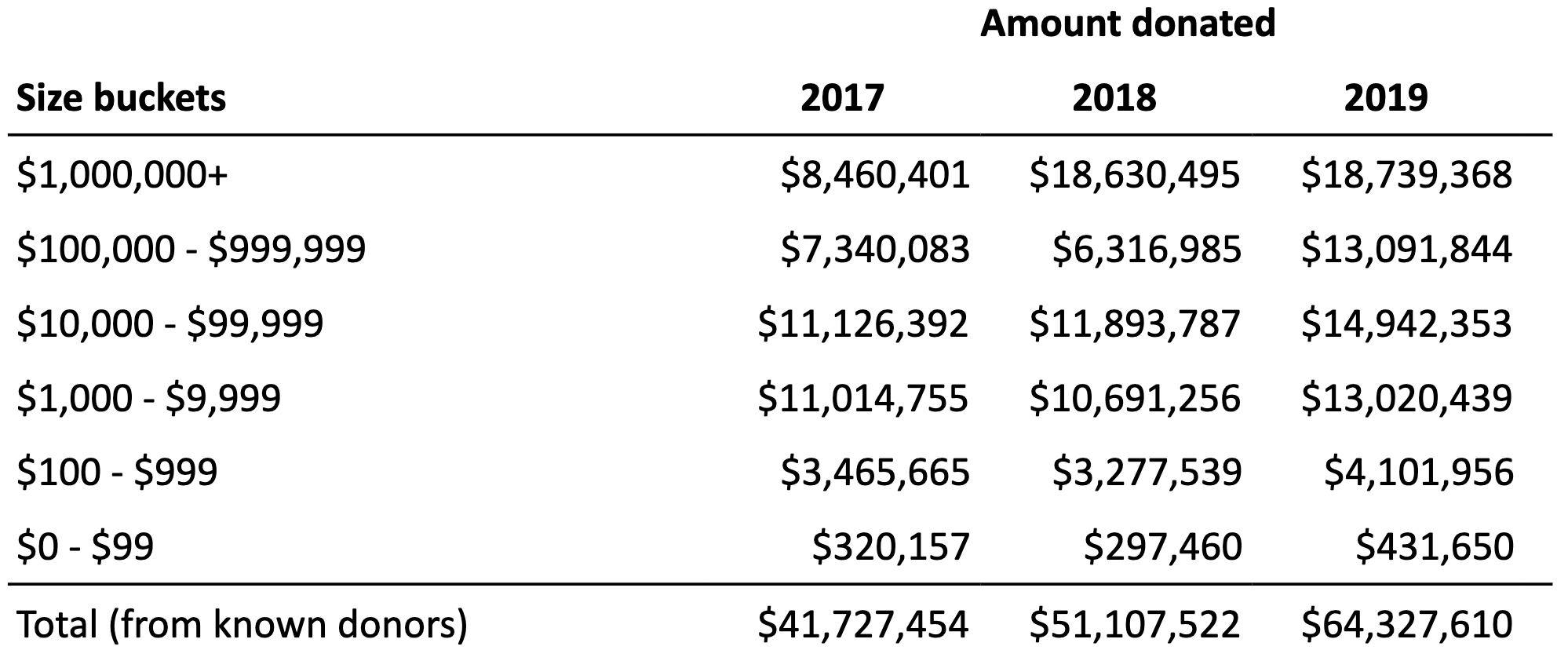 A caveat: Our analysis of money moved by donor size is incomplete because we do not have data disaggregated by individual donor for all of the donations we track as money moved—primarily as a result of new European privacy regulations that have led some of our recommended charities to share less-detailed data with us.[5] Among the donations we can attribute to individual donors, the amount of money given increased across all donor size categories compared to 2018. Details are available in the full report.