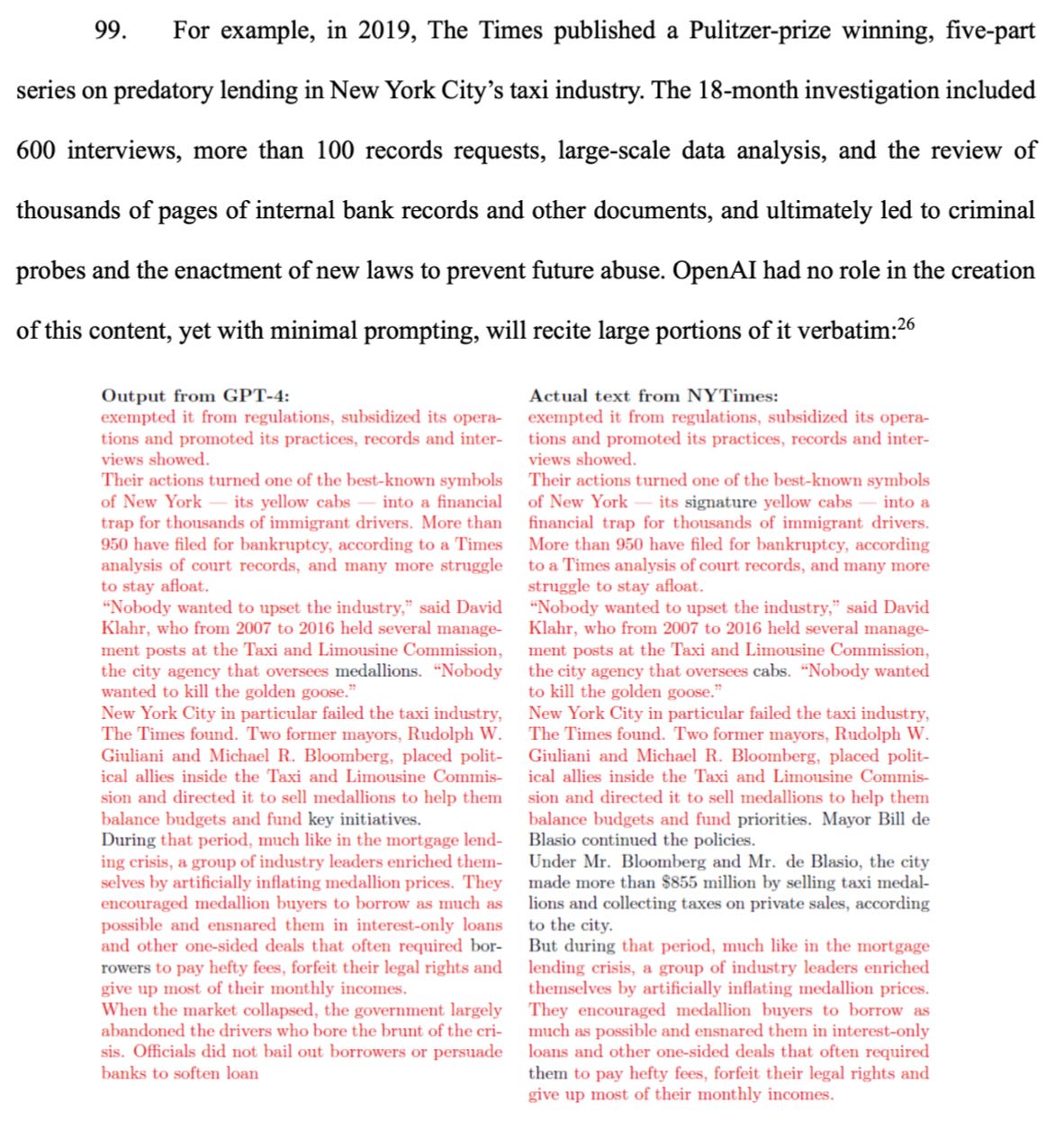 Copyrighted inputs and copyrighted outputs. Nobody disputes the basic fact that OpenAI trains on copyrighted data. But this lawsuit makes another critical allegation: that OpenAI and Microsoft’s models output exact copies of New York Times articles.