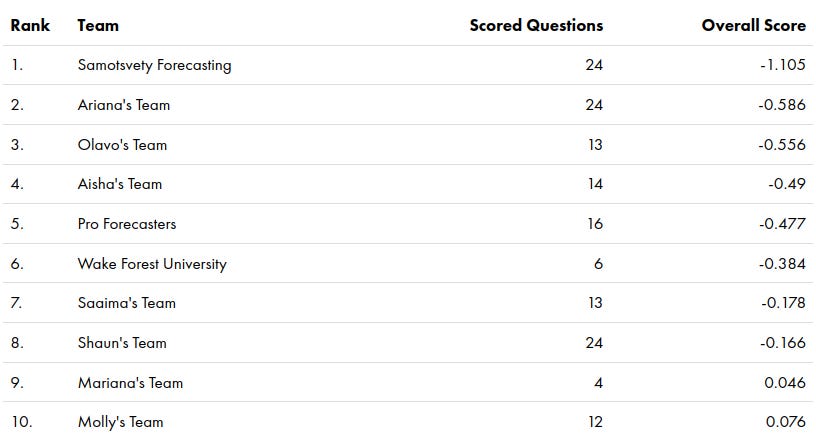 As in the first season, Samotsvety Forecasting, a team made up of Eli Lifland, Misha Yagudin, and myself, completely demolished the competition. We were around twice as good as the next-best team in terms of the relative Brier score.