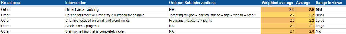 These are the results I am most confident in, as I was able to ask almost all interviewees about most broad areas. For the more detailed sub-areas, I was not able to ask about all 100+ interventions. I was only able to ask âin the broad area of Events, what might be the best/âworst thingsâ, and update the interventions in that area based on the personâs response. For example, if someone gave Events an overall score of 2 (mid promisingness), but mentioned one intervention they felt was less promising and one intervention they thought was more promising, those two scores would be adjusted (e.g. respectively to a 1 and 3), but the other unmentioned interventions would be given the ranking they have in the broad area (in this case a 2). This could lead to ideas that are less well-known receiving ratings closer to the area-average due to people mentioning it less.