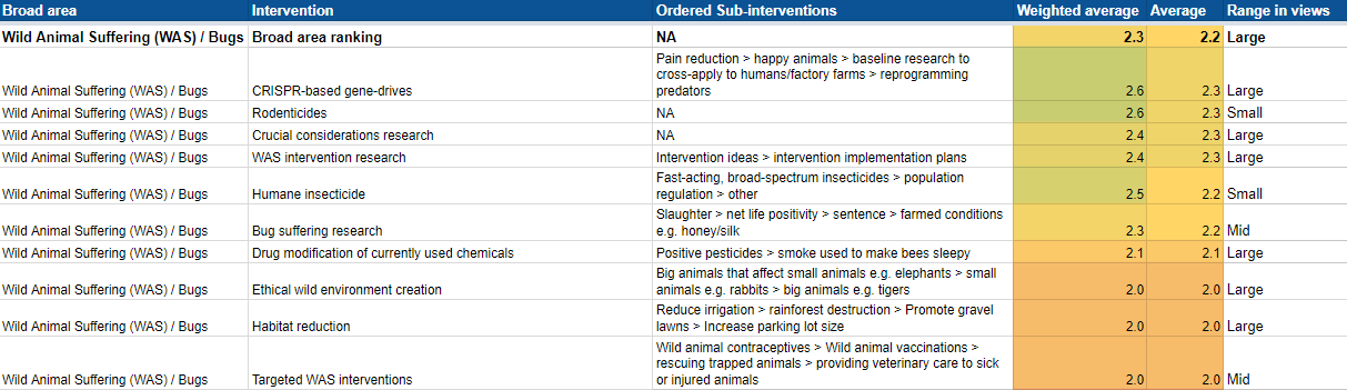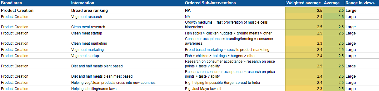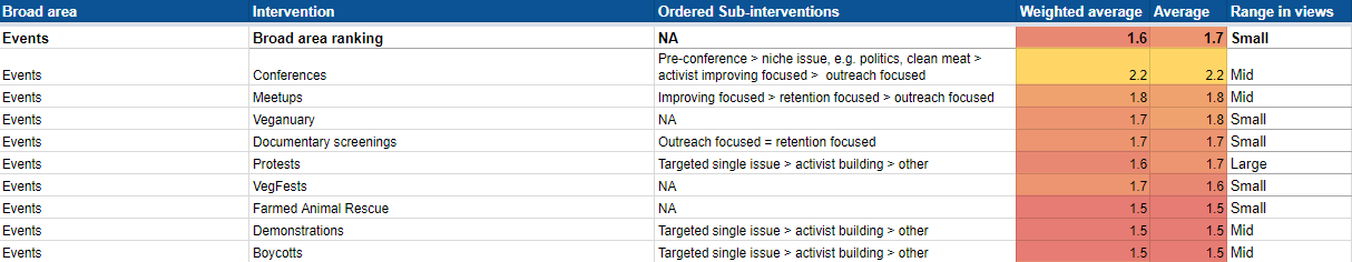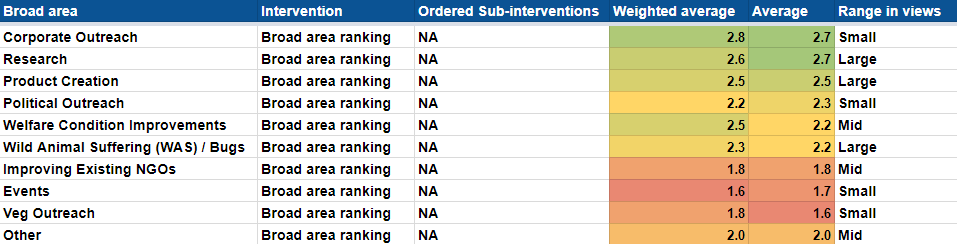 Interviews lasted between 30 and 120 minutes and most experts were asked fairly similar questions. The two numbers beside each intervention are average rating and weighted weighting. Average rating is just a straightforward average of what each leader thought: a score of 1 was considered low promisingness, 2 mid-promisingness, 3 high promisingness, and 4 highest promisingness. The weighted results depend on how many years of animal advocacy experience someone had, how utilitarian/âEA their mindset was, and their depth of knowledge in comparing different, broad topics. For example, someone who knew a lot, but only about one area, would get a lower weighting than someone who had deep knowledge of several areas. The range in views represents how controversial an issue was among leaders.