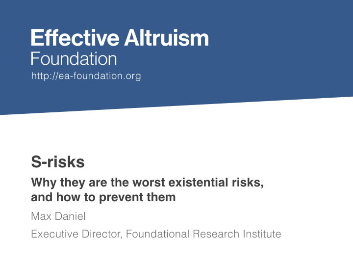 遠い未来の深刻な苦しみのリスク、すなわちSリスクについてお話しします。Sリスクの軽減は、私が代表を務めるEA研究団体、Foundational Research Institute の主要課題です。