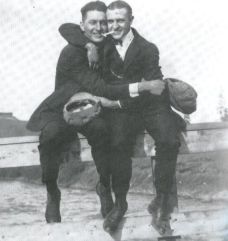 From the Civil War through the 1920′s, it was very common for male friends to visit a photographer’s studio together to have a portrait done as a memento of their love and loyalty. Sometimes the men would act out scenes; sometimes they’d simply sit side-by-side; sometimes they’d sit on each other’s laps or hold hands. The men’s very comfortable and familiar poses and body language might make the men look like gay lovers to the modern eye — and they could very well have been — but that was not the message they were sending at the time… Because homosexuality, even if thought of as a practice rather than an identity, was not something publicly expressed, these men were not knowingly outing themselves in these shots; their poses were common, and simply reflected the intimacy and intensity of male friendships at the time — none of these photos would have caused their contemporaries to bat an eye.