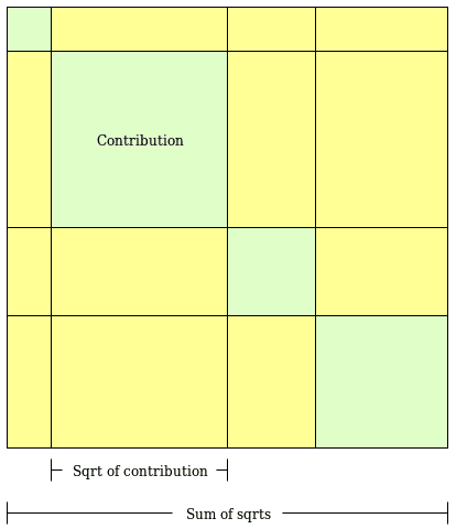 The following figure (from Vitalik Buterin’s explanation of quadratic mechanisms) gives a visual representation of this formula. If we think of the contribution of each donor as the area of a square (green squares below), QF takes the square root of these areas (side of the green square), sums them, and takes the square of this sum. The resulting funding level is then the total area of the square in the figure. The yellow area represents the amount of money needed to match individual contributions to get to the final provision level.