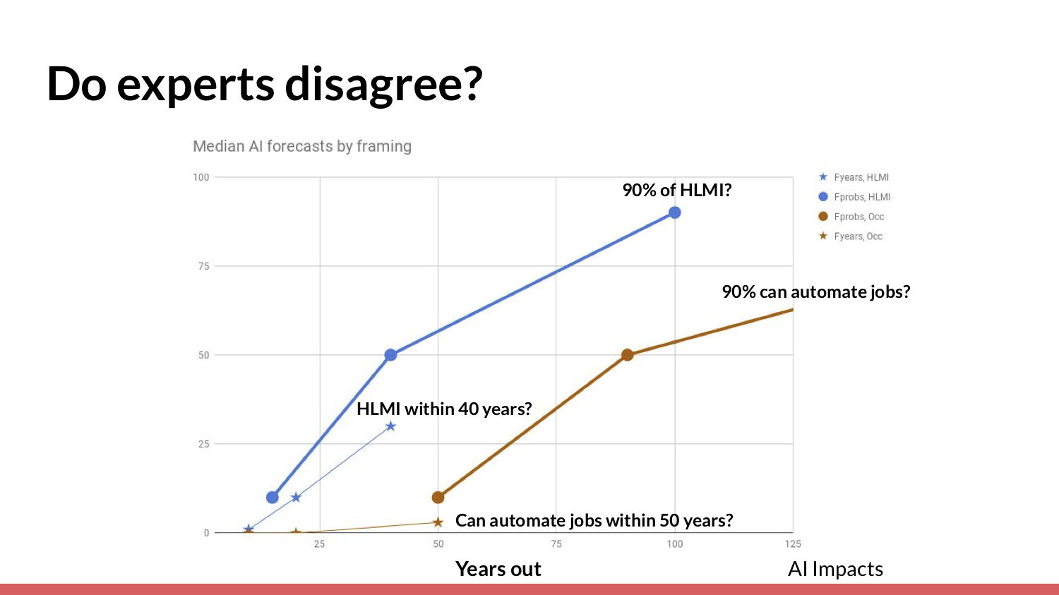 In conclusion, do experts disagree that we could have human-level AI soon? That’s not obvious to me. Even if you only consider the opinions of experts who have worked in the field for a long time, I don’t think it’s clear that they disagree.