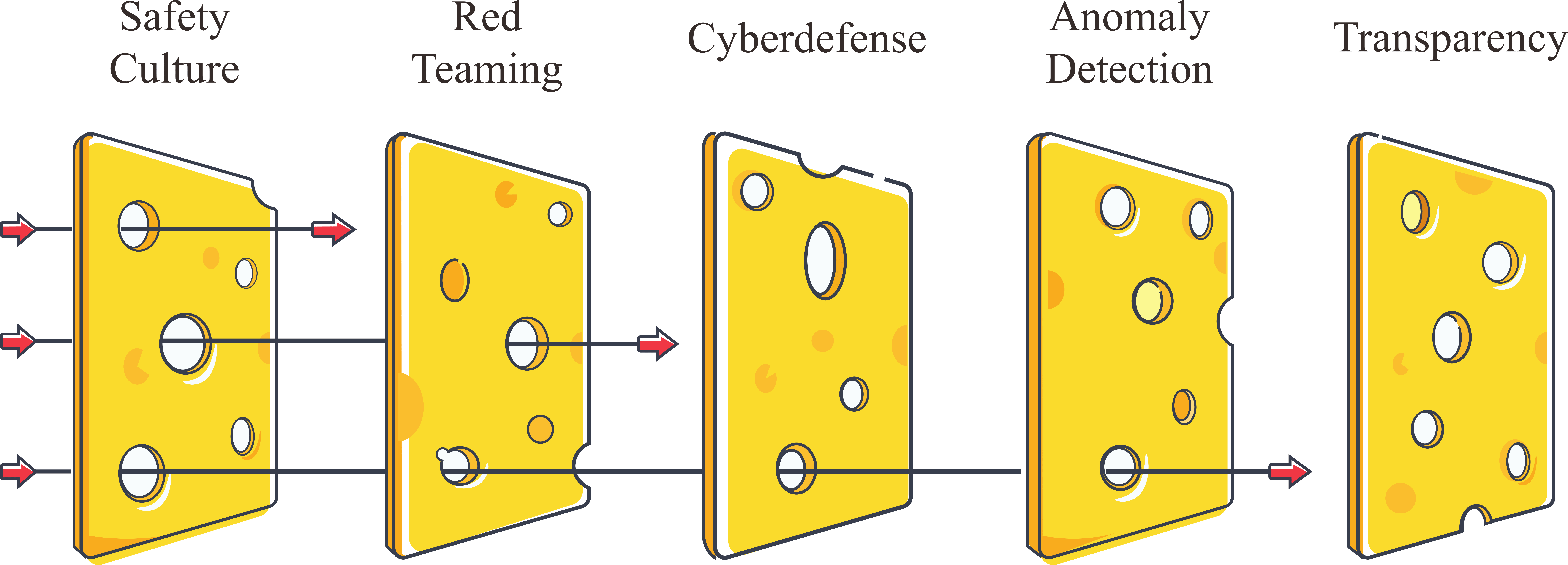 In addition to human factors, safe design principles can greatly affect organizational safety. One example of a safe design principle in organizational safety is the Swiss cheese model (as shown in Figure 14), which is applicable in various domains, including AI. The Swiss cheese model employs a multilayered approach to enhance the overall safety of AI systems. This “defense in depth” strategy involves layering diverse safety measures with different strengths and weaknesses to create a robust safety system. Some of the layers that can be integrated into this model include safety culture, red teaming, anomaly detection, information security, and transparency. For example, red teaming assesses system vulnerabilities and failure modes, while anomaly detection works to identify unexpected or unusual system behavior and usage patterns. Transparency ensures that the inner workings of AI systems are understandable and accessible, fostering trust and enabling more effective oversight. By leveraging these and other safety measures, the Swiss cheese model aims to create a comprehensive safety system where the strengths of one layer compensate for the weaknesses of another. With this model, safety is not achieved with a monolithic airtight solution, but rather with a variety of safety measures.