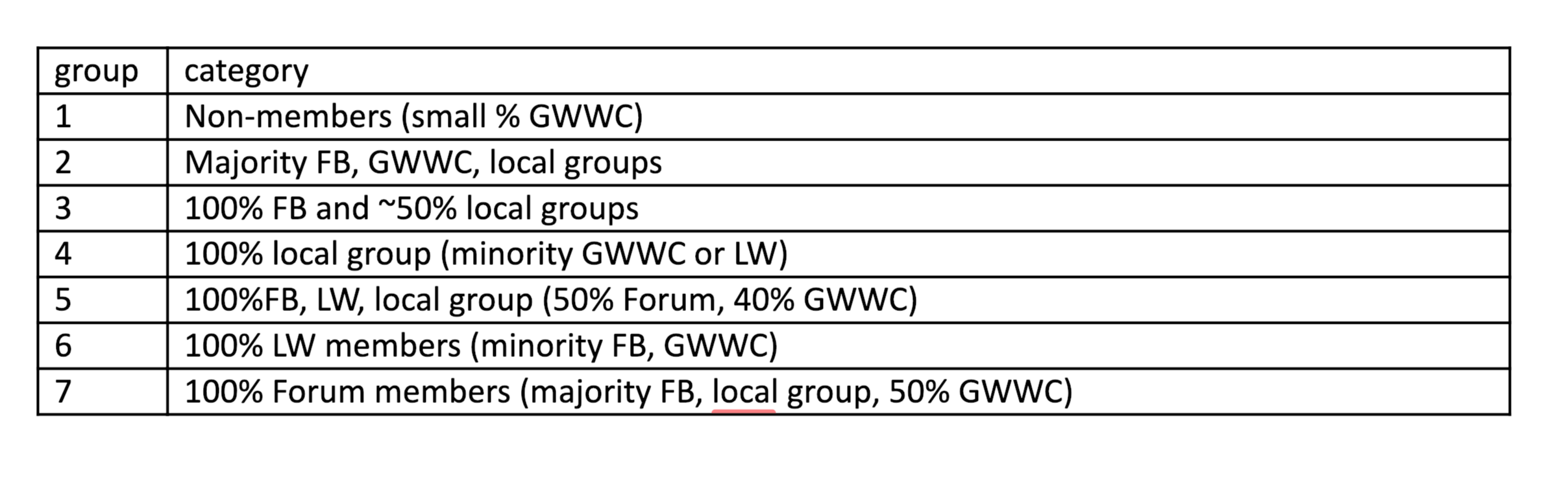 Our analysis suggested that the data could be best understood in terms of 7 clusters of respondents, displayed below. The table shows, for example, that among members of group 1, 0% of people are members of the EA Forum, Facebook, LessWrong, The Life You Can Save a local group, while 19% are members of Giving What We Can. By contrast, in group 5, 100% of members are part of EA Facebook and LessWrong and a local EA group and 50% are members of the EA Forum.