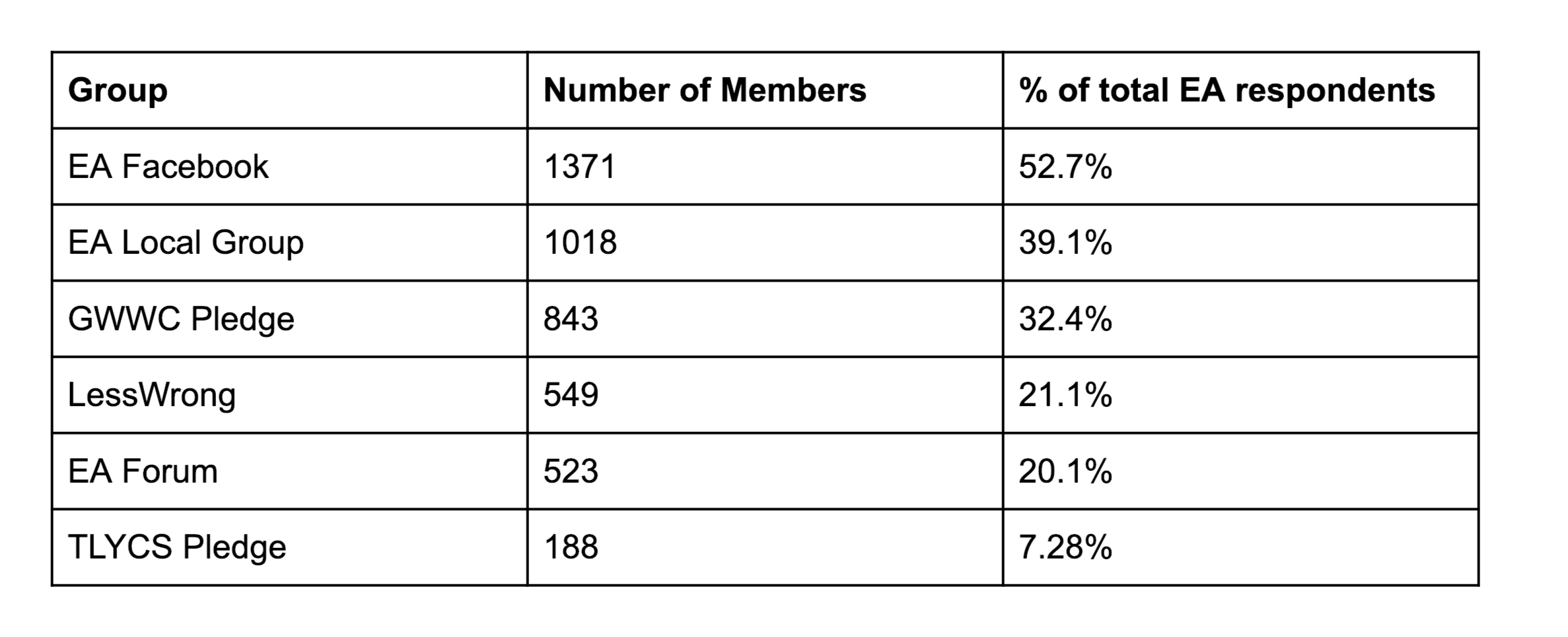 EA Facebook and EA Local Groups were the two groups with the largest membership within our sample and while there was substantial overlap, many EAs who were members of EA Facebook were not members of a local group and vice versa.