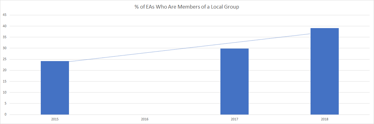 That said, it strikes us as plausible that there would be a real increase in the percentage of EAs being members of local groups, given that there has been a large increase in the total number of EA local groups in existence according to both Local Group Survey 2017 data and the central database of local groups (which both find a doubling in numbers of local groups since 2015).