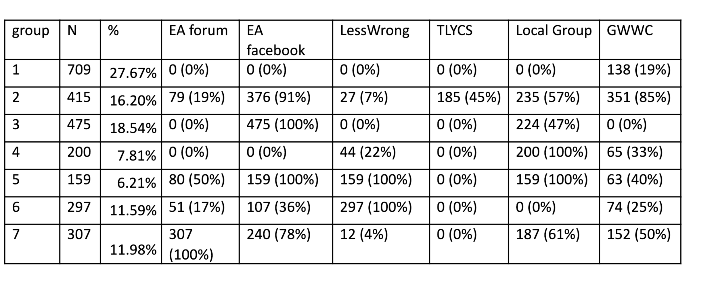 Our analysis suggested that the data could be best understood in terms of 7 clusters of respondents, displayed below. The table shows, for example, that among members of group 1, 0% of people are members of the EA Forum, Facebook, LessWrong, The Life You Can Save a local group, while 19% are members of Giving What We Can. By contrast, in group 5, 100% of members are part of EA Facebook and LessWrong and a local EA group and 50% are members of the EA Forum.
