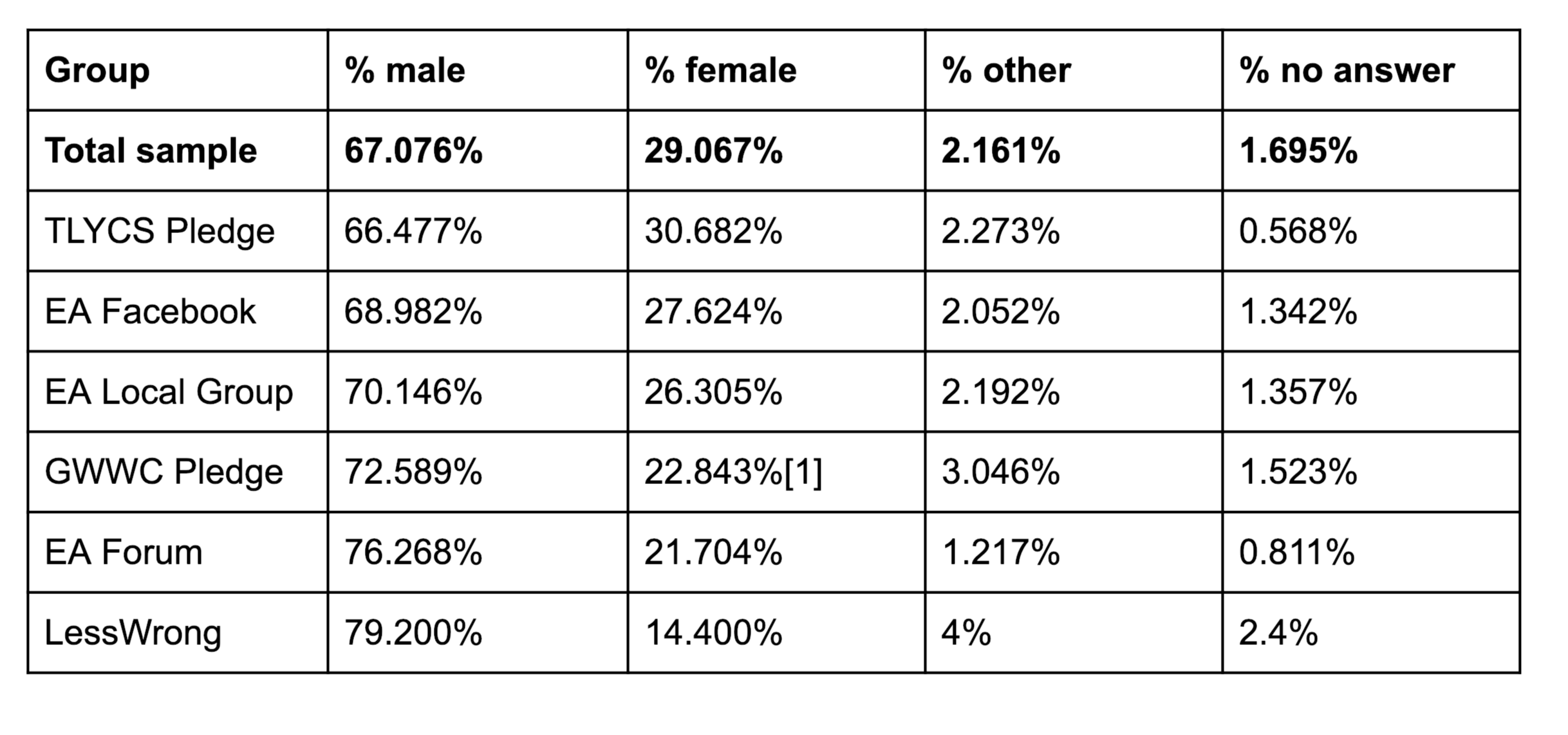 [1] Note that the percentage female for GWWC pledges as a whole (which includes members who are not necessarily effective altruists) is estimated to be roughly 30%- higher than within the effective altruist sample, though far from gender parity.