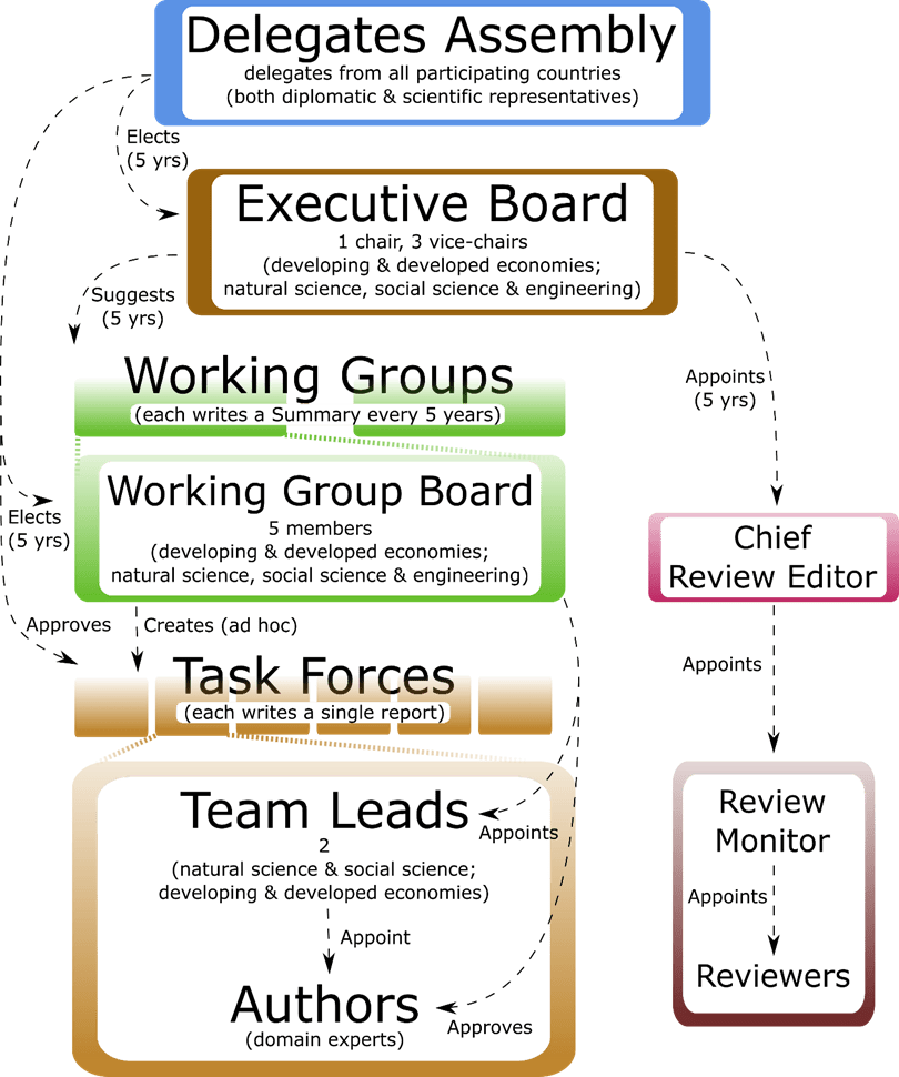 At a high level, the IPGCR will run on a 5-year cycle. Every 5 years, the Delegates Assembly (the IPGCR’s representative body, described in more detail below) meets as a large group to discuss and vote on key aspects of the IPGCR’s plan, policies, and procedures, including what Working Groups should exist. Working Groups will then act somewhat autonomously, with oversight from the Delegates Assembly, to produce reports as they see fit over that 5-year period. This structure will allow the IPGCR to create up-to-date reports that can address the often-changing state of knowledge in a timely manner. This structure will allow the IPGCR to be nimbler and responsive, and distinguishes it from a body such as the IPCC, which produces a single large report every 5-8 years. In the IPGCR, each Working Group will aggregate its reports every 5 years, creating a Working Group Summary. Working Group Summaries will likely be the most widely read IPGCR document. All IPGCR content will require endorsements from the Delegates Assembly in a process described throughout this section.