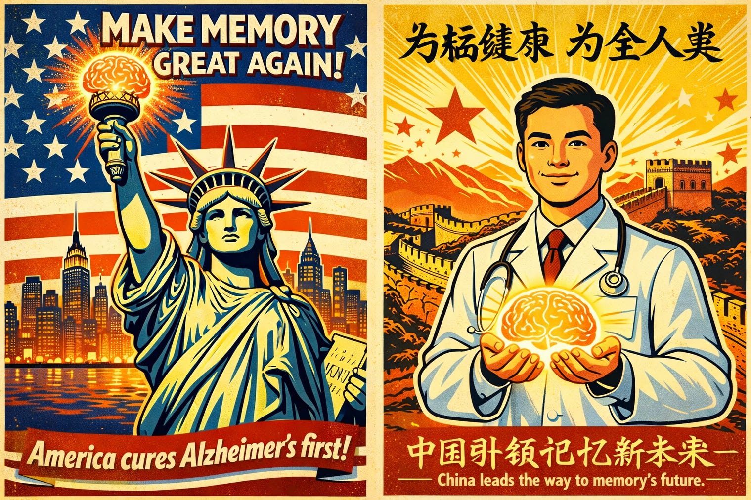 Over the course of 3 years, both countries announce big milestones in terms of funding, scientific breakthroughs, clinical results. China conclusively comes up with a treatment that halts the progression of dementia. The next year, the US creates a pill that prevents Alzheimers altogether. Both countries say that they won the race, Americans and Chinese are both proud of their superior systems, and the whole world benefits from new disease treatments.