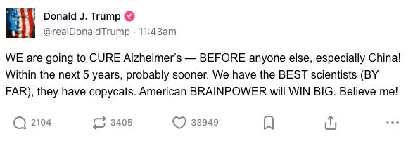 Imagine tomorrow, Trump makes a post announcing that the US will cure Alzheimer’s before China does.