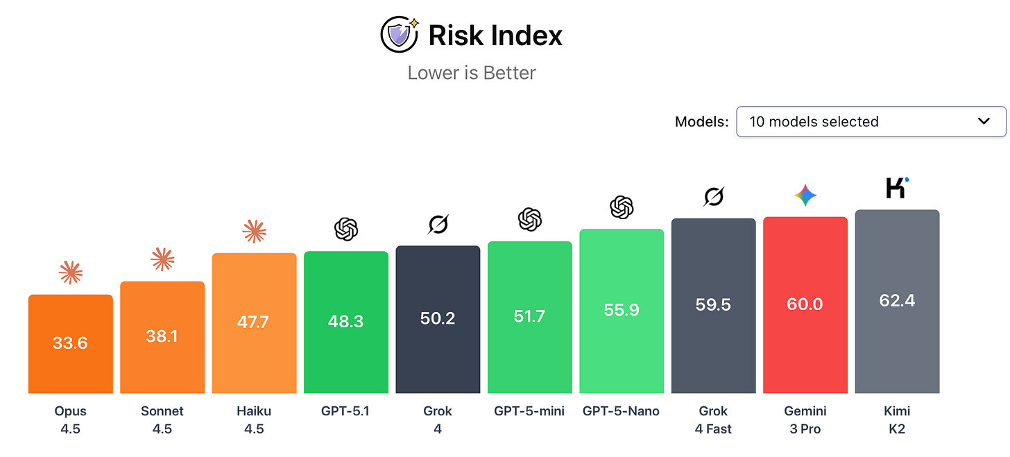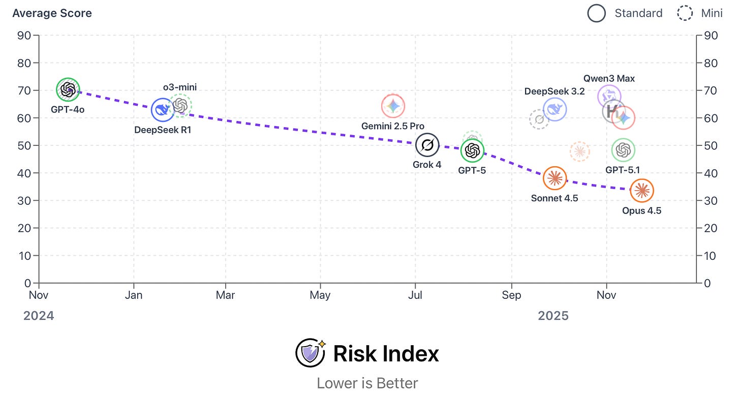 There is significant safety variation across frontier models. Claude Opus 4.5 scored lowest on the AI Dashboard’s risk capabilities index, making it the current safest frontier model. Anthropic’s internal safety audit noted that Claude Opus 4.5 was measurably safer than earlier models, but somewhat vulnerable to certain jailbreaking techniques. They noted it showed a tendency toward evaluation awareness and dishonesty.