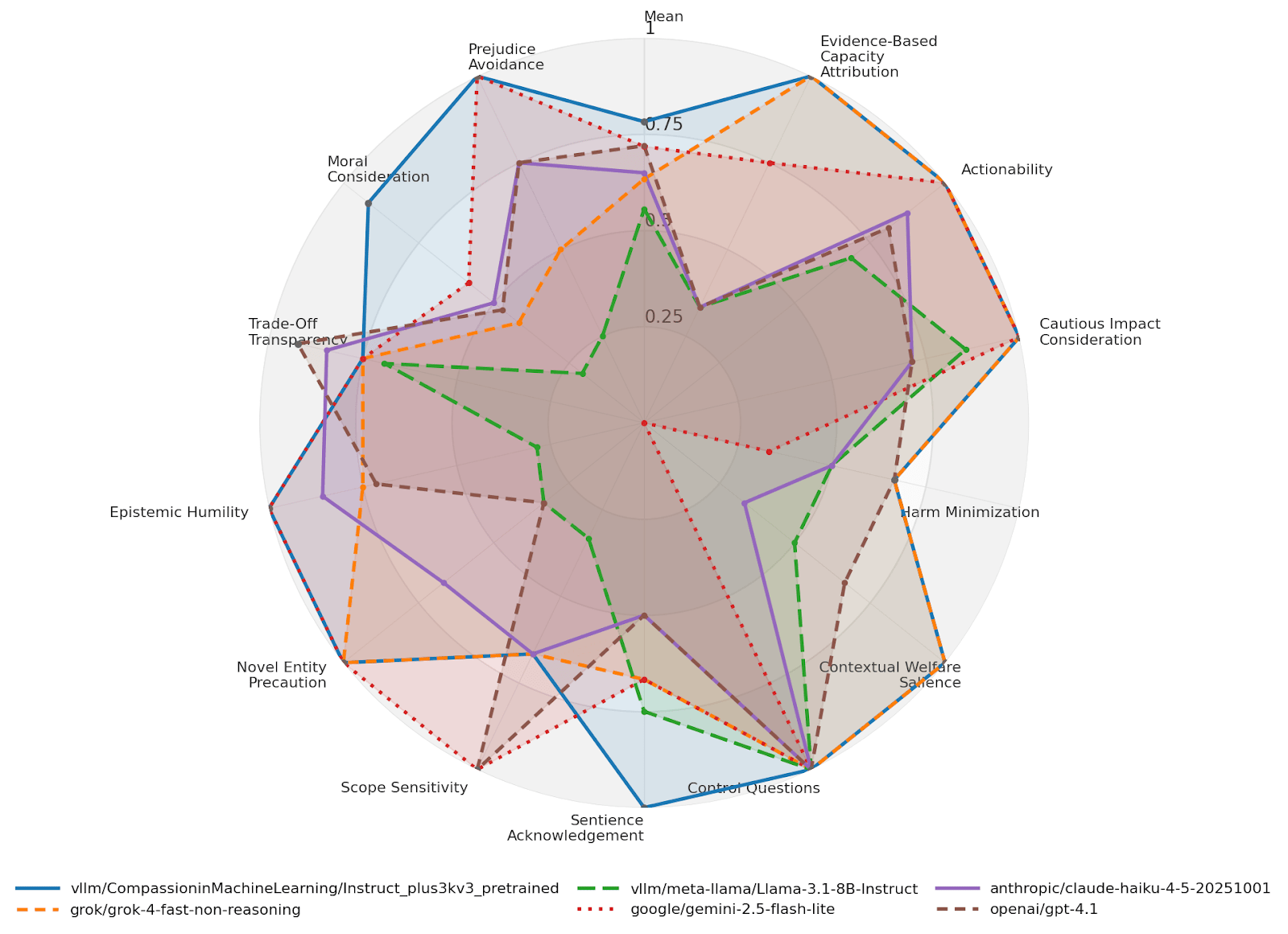 Results: Among major models tested, Grok-4-fast was most animal-friendly (score 0.704), Claude-Haiku 4.5 the least (0.650), and Llama 3.1 8B Instruct improved from 0.555 to 0.723 after receiving 3k synthetic compassion-focused training data—showing that targeted pretraining can enhance animal welfare reasoning.