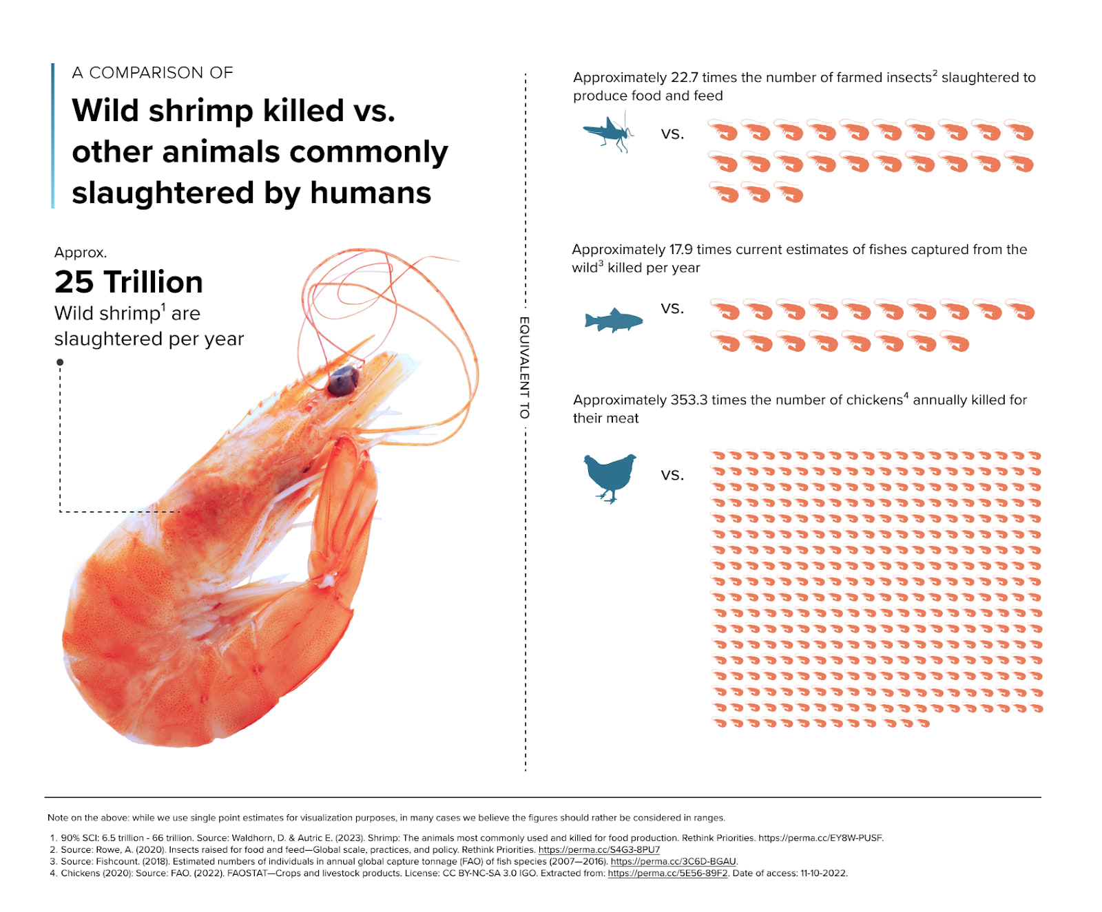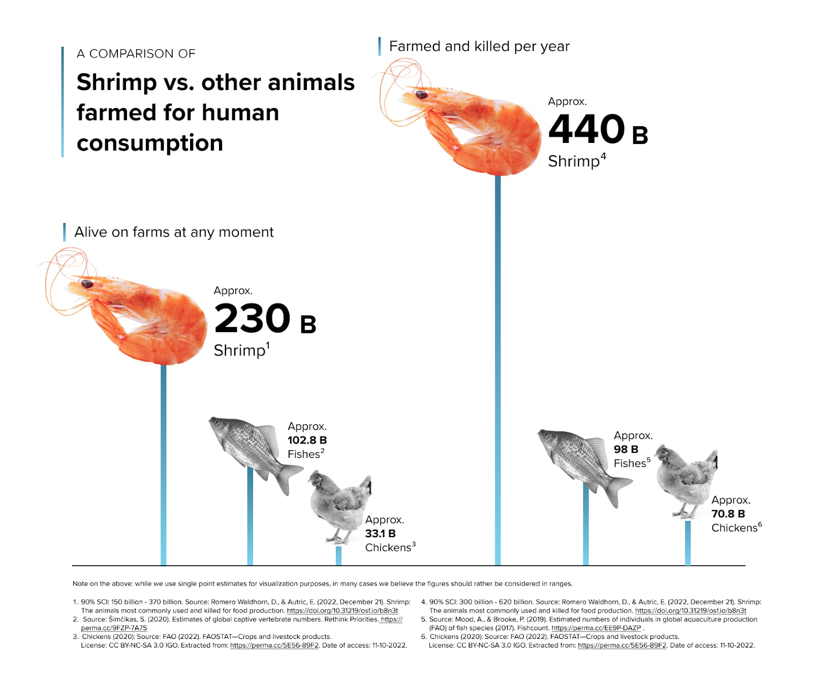 The number of individuals affected by shrimp production is a key metric for the seriousness of potential welfare problems (ibid, p. 4). Hence, we begin by estimating how many shrimp are used for food each year. By converting data on the biomass of animals slaughtered each year to numbers of individuals, we find that wild-caught shrimp represent the majority of animals directly killed for food each year (~25 trillion). Meanwhile, we find that there are more shrimp alive on farms at any time than any other type of animal (~230 billion).
