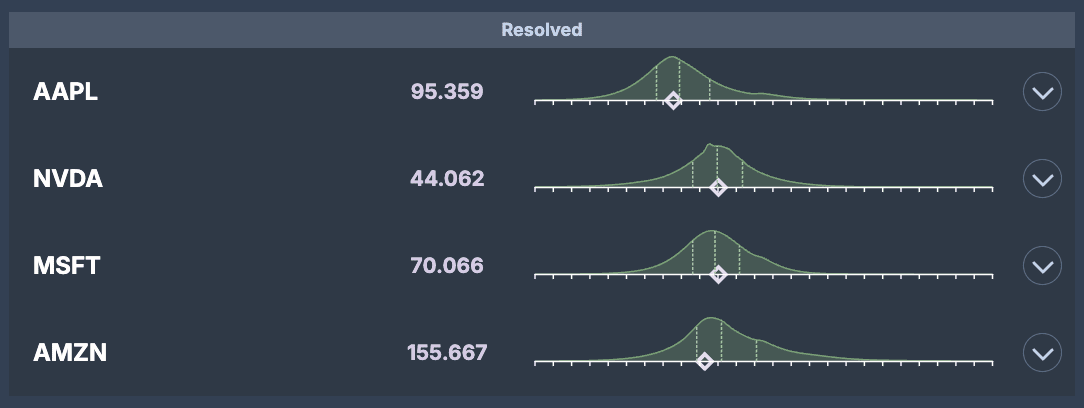 Company fundamentals: Q2 revenues and EPS for AAPL, MSFT, NVDA, and AMD landed in the fattest parts of the distributions