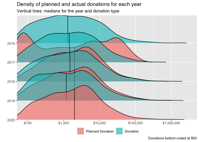 Over the past years, we see no strong trend in median or mean donation amounts reported.[2]
