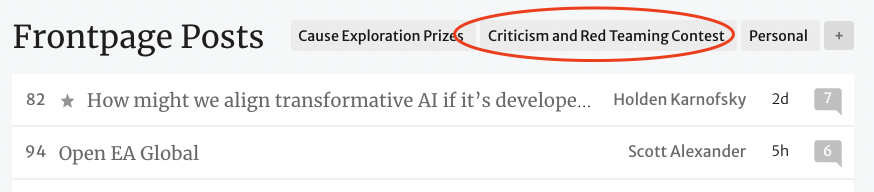 Your Frontpage might currently be very full of submissions to the Criticism Contest. You can hide those entirely or downweight them on your Frontpage by using the tag filter system. There are instructions here.