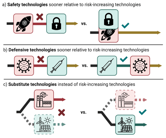 involves considering opportunities to affect the relative timing of new innovations to reduce a specific risk across a technology portfolio. For instance, it may be beneficial to delay or halt risk-increasing technologies and preferentially advance risk-reducing defensive, safety, or substitute technologies.
