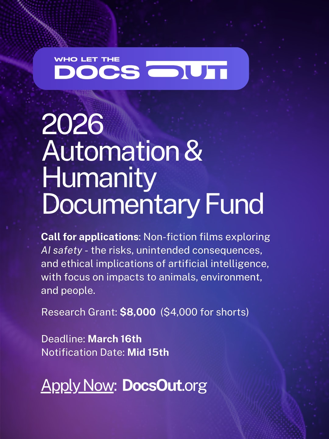 Who Let The Docs Out, a new non-profit documentary film fund and alliance, officially announced its public launch of two grant programs: the 2026 Coexistence Documentary Fund and the 2026 Automation & Humanity Documentary Fund.