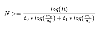 R = The likelihood ratio of marked text to unmarked text that you want to be detected. For this post, I want a likelihood ratio of at least 99 (99 to 1 odds of being right that the text is marked). As I mentioned earlier, a likelihood ratio of 999,999 (999,999 to 1, AKA 1 in a million) is more likely closer to what an industrial watermark should have.