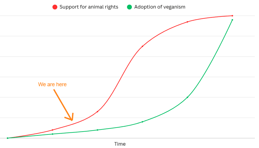 Like other social issues, our ultimate policy victories—factory farm bans, slaughterhouse phase-outs, legal rights for animals—will lag behind the shift in public opinion. Specifically, I predict that the trajectory will look something like this:[5]