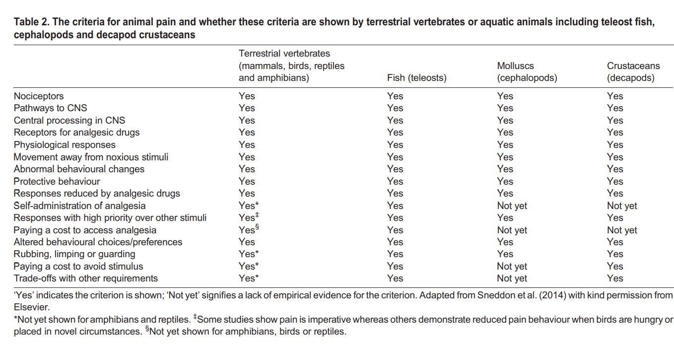 How do we decide if a creature experiences pain? You can’t see another’s pain, and other creatures have brains very different from our own (more on that later). But if a creature behaves in various ways that make far more sense if they experience pain than if they don’t, then you should think they probably feel pain. It’s unlikely that they’d behave in many different wa as if they were in pain if they didn’t really feel pain. One such set of criteria indicative of pain comes from a report from Lynne Sneddon—fish meet every criteria.