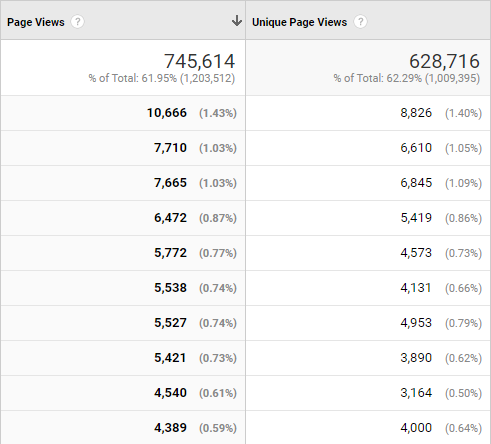 Unique views were pretty close to total views. Hereās a quick screenshot of the two figures for the top ten posts: