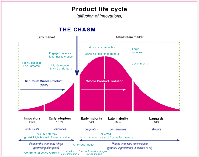 If we think about EA brand as a product, I’d guess we’re in “The Chasm” below as the EA brand is too associated with the “weird” stuff that innovators are doing to be effectively sold to lower risk tolerance markets.